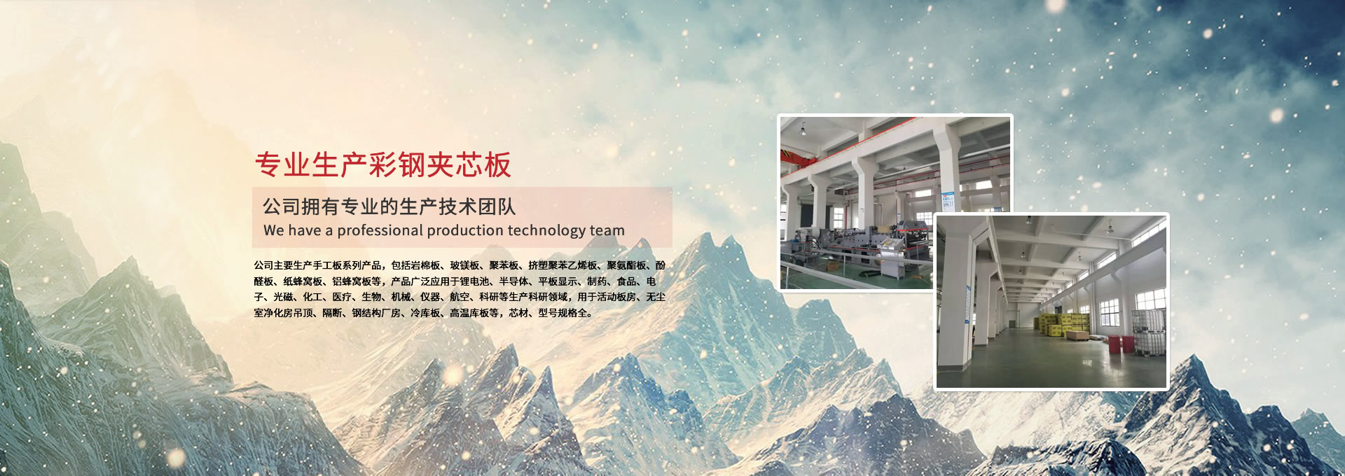 公司主要生產手工板系列產品,包括巖棉板、玻鎂板、聚苯板、擠塑聚苯乙烯板、聚氨酯板、酚醛板、紙蜂窩板、鋁蜂窩板等,產品廣泛應用于鋰電池、半導體、平板顯示、制藥、食品、電子、光磁、化工、醫療、生物、機械、儀器、航空、科研等生產科研領域,用于活動板房、無塵室凈化房吊頂、隔斷、鋼結構廠房、冷庫板、高溫庫板等,芯材、型號規格全。 公司擁有專業的生產技術團隊,周到的服務保證,以“質量至上、信譽至上、服務至上”為宗旨,為用戶提供合格的產品和滿意的服務,歡迎各界朋友參觀、指導!公司竭誠希望與各界朋友建立廣泛聯系,加強相互合作、共同發展!